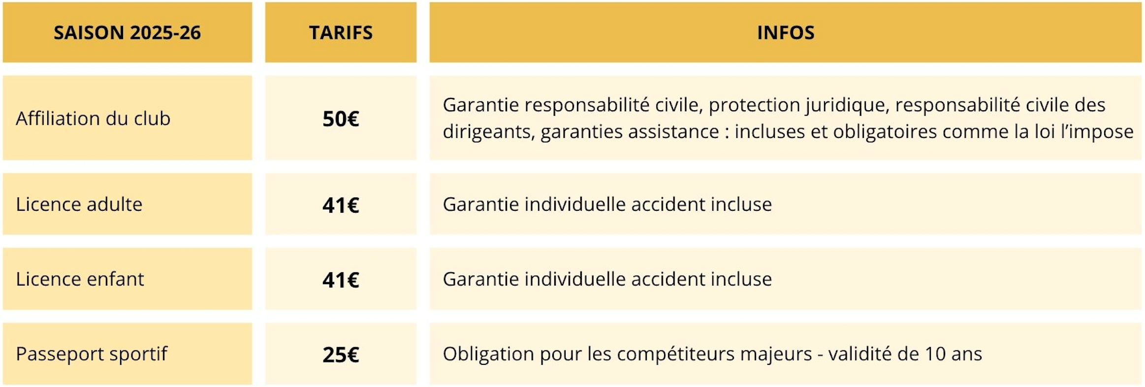 Tarif licence adultes